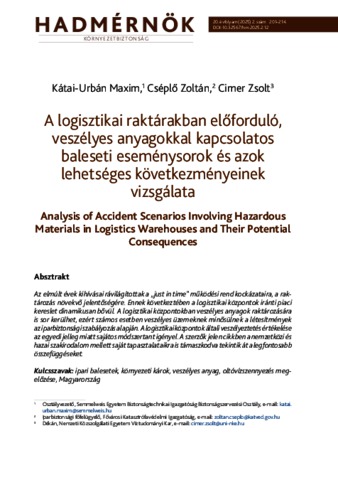 Kátai-Urbán, Maxim and Cséplő, Zoltán and Cimer, Zsolt (2026) A logisztikai raktárakban előforduló, veszélyes anyagokkal kapcsolatos baleseti eseménysorok és azok lehetséges következményeinek vizsgálata = Analysis of Accident Scenarios Involving Hazardous Materials in Logistics Warehouses and Their Potential Consequences. HADMÉRNÖK, 20 (2). pp. 201-214. ISSN 1788-1919