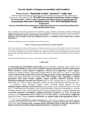 Murányi, Sarolta and Harmati-Pap, Veronika and Kas, Bence and Kohári, Anna (2025) Narratív elemek a hat hónapos csecsemőkhöz szóló beszédben. In: Tudásmegosztás, információkezelés, alkalmazhatóság. A MANYE Kongresszusok Előadásai (14/2). Akadémiai Kiadó, Budapest, pp. 78-89. ISBN 9789636640989
