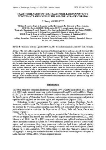 Nancy, Aguierre (2019) Traditional communities, traditional landscapes? : Afro-descendant landscapes in the Colombian Pacific Region. TÁJÖKOLÓGIAI LAPOK / JOURNAL OF LANDSCAPE ECOLOGY, 17 (Specia). pp. 47-63. ISSN 1589-4673