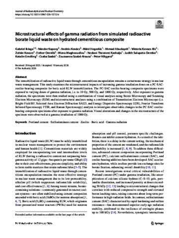 Iklaga, Gabriel Inalegwu and Kaposy, Nándor and Kovács, András and Hegedűs, M and Abudayeh, Ahmad and Kovácsné Kis, Viktória and Kovács, Zoltán and Orenibi, Esther Oluwabunmi and Maghsoudlou, Mona and Kashaija, Nedson and Salupeto-Dembo, J and Gméling, Katalin and Szabó, Csaba and Szabó-Krausz, Zsuzsanna and Völgyesi, Péter (2026) Microstructural effects of gamma radiation from simulated radioactive borate liquid waste on hydrated cementitious composite. JOURNAL OF RADIOANALYTICAL AND NUCLEAR CHEMISTRY- LETTERS. ISSN 0236-5731 (In Press)