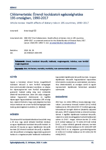 Erdei, Gergő (2019) Cikkismertetés: Étrendi kockázatok egészséghatása 195 országban, 1990-2017 = Article review: Health effects of dietary risks in 195 countries, 1990–2017. EGÉSZSÉGFEJLESZTÉS, 60 (4). pp. 61-63. ISSN 1786-2434 (nyomtatott); 2498-6666 (elektronikus)