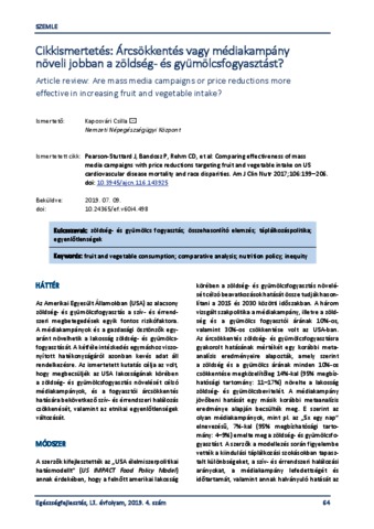 Kaposvári, Csilla (2019) Cikkismertetés: Árcsökkentés vagy médiakampány növeli jobban a zöldség- és gyümölcsfogyasztást? = Article review: Are mass media campaigns or price reductions more effective in increasing fruit and vegetable intake? EGÉSZSÉGFEJLESZTÉS, 60 (4). pp. 64-65. ISSN 1786-2434 (nyomtatott); 2498-6666 (elektronikus)