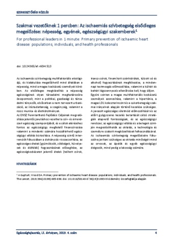 Vitrai, József (2019) Szakmai vezetőknek 1 percben: Az ischaemiás szívbetegség elsődleges megelőzése: népesség, egyének, egészségügyi szakemberek = For professional leaders in 1 minute: Primary prevention of ischaemic heart disease: populations, individuals, and health professionals. EGÉSZSÉGFEJLESZTÉS, 60 (4). p. 4. ISSN 1786-2434 (nyomtatott); 2498-6666 (elektronikus)