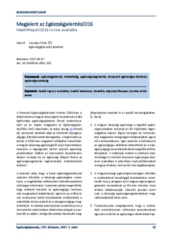 Varsányi, Péter (2017) Megjelent az Egészségjelentés2016 = HealthReport2016 is now available. EGÉSZSÉGFEJLESZTÉS, 58 (2). pp. 32-33. ISSN 1786-2434 (nyomtatott); 2498-6666 (elektronikus)