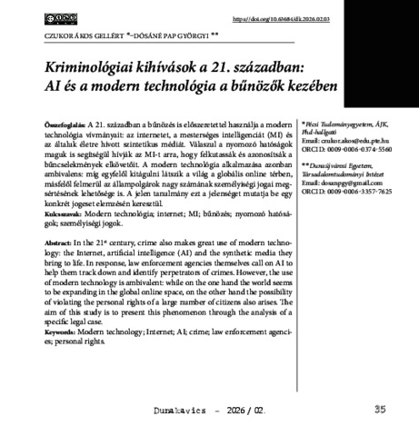 | Uncontrolled Keywords: | Modern technológia, internet, MI, bűnözés, nyomozó hatóságok, személyiségi jogok |