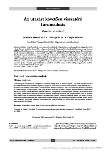 Dömötör, Marcell and Csősz, Judit and Oroján, Iván (2026) Az utazást követően visszatérő furunculosis : Klinikai áttekintés = Post-travel recurrent furunculosis : Clinical perspective. ORVOSI HETILAP, 167 (9). pp. 347-350. ISSN 0030-6002