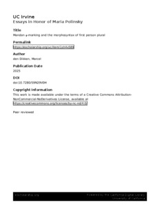 den Dikken,, Marcel (2025) Mandan φ-marking and the morphosyntax of first person plural. In: Syntax in uncharted territories: Essays in Honor of Maria Polinsky. eScholarship, Berkeley, CA, Berkeley, pp. 151-163.