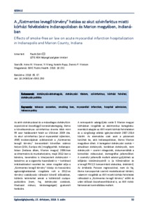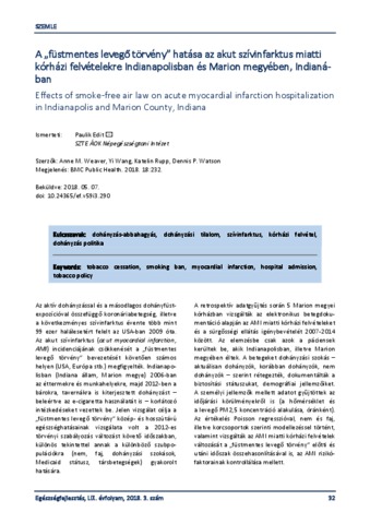 Paulik, Edit (2018) A „füstmentes levegő törvény” hatása az akut szívinfarktus miatti kórházi felvételekre Indianapolisban és Marion megyében, Indianában = Effects of smoke-free air law on acute myocardial infarction hospitalization in Indianapolis and Marion County, Indiana. EGÉSZSÉGFEJLESZTÉS, 59 (3). pp. 32-33. ISSN 1786-2434 (nyomtatott); 2498-6666 (elektronikus)