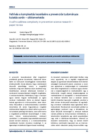 Krakkó, Ágnes (2018) Felhívás a komplexitás kezelésére a prevenciós tudományos kutatás során – cikkismertetés = A call to address complexity in prevention science research –paper review. EGÉSZSÉGFEJLESZTÉS, 59 (3). pp. 41-43. ISSN 1786-2434 (nyomtatott); 2498-6666 (elektronikus)