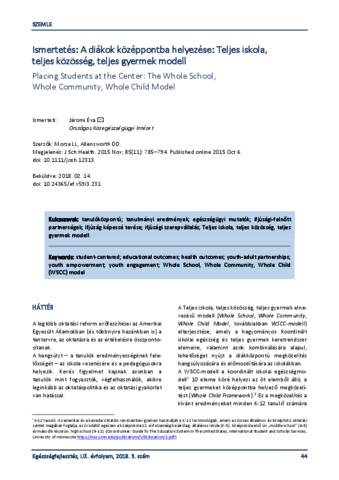 Járomi, Éva (2018) Ismertetés: A diákok középpontba helyezése: Teljes iskola, teljes közösség, teljes gyermek modell = Placing Students at the Center: The Whole School, Whole Community, Whole Child Model. EGÉSZSÉGFEJLESZTÉS, 59 (3). pp. 44-51. ISSN 1786-2434 (nyomtatott); 2498-6666 (elektronikus)