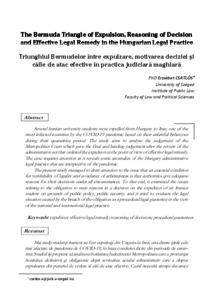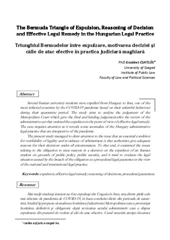 Several Iranian university students were expelled from Hungary to Iran, one of the most infected countries by the COVID-19 pandemic based on their unlawful behaviour during their quarantine period. The study aims to analyse the judgement of the Metropolitan Court which gave the final and binding judgement after the review of the administrative act that ordered the expulsion in the point of view of effective legal remedy. The case requires attention as it reveals some anomalies of the Hungary administrative legal practice that are irrespective of the pandemic. The present study managed to draw attention to the issue that an essential condition for verifiability of legality and avoidance of arbitrariness is that authorities give adequate reasons for their decisions under all circumstances. To that end, it examined the issues relating to the obligation to state reasons in a decision on the expulsion of an Iranian student on grounds of public policy, public security, and it tried to evaluate the legal situation caused by the breach of the obligation as a procedural legal guarantee in the view of the national and international legal practice. | Mai mulţi studenţi iranieni au fost expulzaţi din Ungaria în Iran, una dintre ţările cele mai afectate de pandemia de COVID-19, în baza conduitei ilicite din perioada de carantină. Studiul îşi propune să analizeze hotărârea Judecătoriei Metropolitane care a pronunţat hotărârea definitivă şi obligatorie după revizuirea actului administrativ care a dispus expulzarea din punctul de vedere al căii de atac efective. Cazul necesită atenţie deoarec dezvăluie unele anomalii ale practicii administrative din Ungaria, care depăşesc situaţia pandemică. Prezentul studiu atrage atenţia asupra faptului că o condiţie esenţială pentru verificarea legalităţii şi evitarea arbitrariului este ca autorităţile să îşi motiveze deciziile în mod adecvat, în toate circumstanţele. În acest scop, a examinat aspectele legate de obligaţia de motivare a unei decizii privind expulzarea unui student iranian pe motive de ordine publică, securitate publică, şi a încercat să evalueze situaţia juridică cauzată de încălcarea acestei obligaţii, ca garanţie juridică procesuală în perspectiva practicii juridice naţionale şi internaţionale.