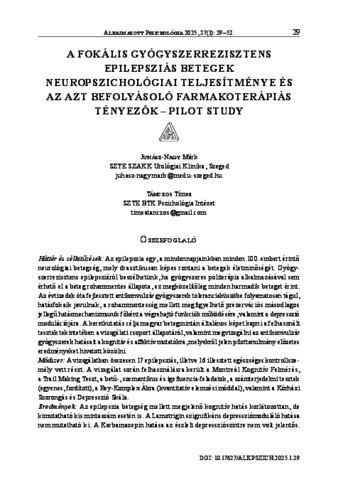 Juhász-Nagy, Márk and Tánczos, Tímea (2025) A fokális gyógyszerrezisztens epilepsziás betegek neuropszichológiai teljesítménye és az azt befolyásoló farmakoterápiás tényezők – Pilot study = Neuropsychological assessment of focal drug-resistant epileptic patients in light of pharmacotherapy effects. ALKALMAZOTT PSZICHOLÓGIA, 27 (1). pp. 29-52. ISSN 1419-872X
