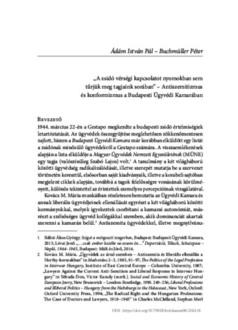 Ádám, István Pál and Buchmüller, Péter (2024) "A zsidó vérségi kapcsolatot nyomokban sem tűrjük meg tagjaink sorában" : Antiszemitizmus és konformizmus a Budapesti Ügyvédi Kamarában. In: A holokauszt Magyarországon nyolcvan év múltán. Országos Rabbiképző - Zsidó Egyetem (ORZSE), Budapest, pp. 15-45. ISBN 9786155494154