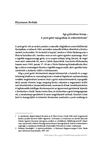 Klacsmann, Borbála (2024) Egy gyötrelmes hónap: A pesti gettó topográfiája és mikrotörténete. In: A holokauszt Magyarországon nyolcvan év múltán. Országos Rabbiképző - Zsidó Egyetem (ORZSE), Budapest, pp. 126-153. ISBN 9786155494154