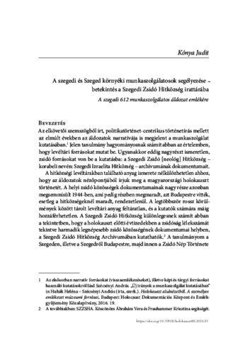 Kónya, Judit (2024) A szegedi és Szeged környéki munkaszolgálatosok segélyezése – betekintés a Szegedi Zsidó Hitközség irattárába : A szegedi 612 munkaszolgálatos áldozat emlékére. In: A holokauszt Magyarországon nyolcvan év múltán. Országos Rabbiképző - Zsidó Egyetem (ORZSE), Budapest, pp. 71-97. ISBN 9786155494154