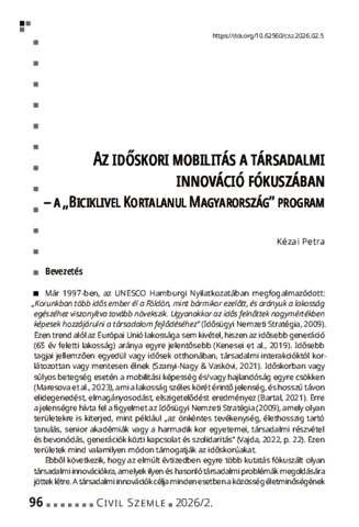 Kézai, Petra Kinga (2026) Az időskori mobilitás a társadalmi innováció fókuszában : a „Biciklivel Kortalanul Magyarország” program. CIVIL SZEMLE, 23 (2). pp. 96-113. ISSN 1786-3341