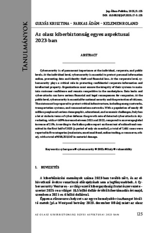 Gulyás, Krisztina and Farkas, Ádám and Kelemen, Roland (2025) Az olasz kiberbiztonság egyes aspektusai 2023-ban. JOG ÁLLAM POLITIKA: JOG- ÉS POLITIKATUDOMÁNYI FOLYÓIRAT, 17 (3). pp. 125-144. ISSN 2060-4580