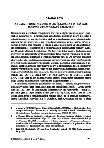 B. Halász, Éva (2025) A prágai Nemzeti Múzeum levéltárának 14. századi magyar vonatkozású oklevelei. FONS: FORRÁSKUTATÁS ÉS TÖRTÉNETI SEGÉDTUDOMÁNYOK, 32 (4). pp. 407-418. ISSN 1217-8020 (nyomtatott); 1588-0516 (elektronikus)