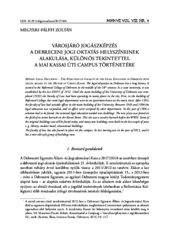 Megyeri-Pálffi, Zoltán (2017) Városjáró jogászképzés : A debreceni jogi oktatás helyszíneinek alakulása, különös tekintettel a mai Kassai úti Campus történetére. GERUNDIUM: EGYETEMTÖRTÉNETI KÖZLEMÉNYEK, 8 (4). pp. 88-103. ISSN 2061-5132