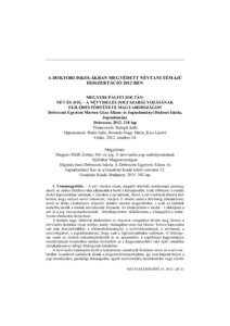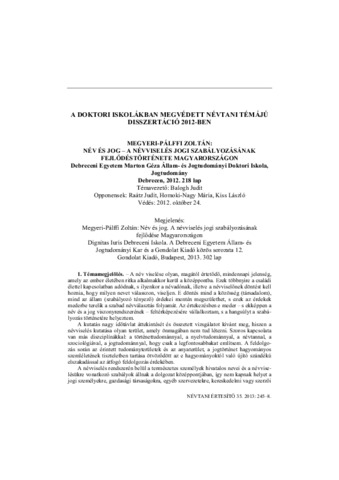 Megyeri-Pálffi, Zoltán (2013) A doktori iskolákban megvédett névtani témájú disszertáció 2012-ben: Megyeri-Pálffi Zoltán Név és jog – A névviselés jogi szabályozásának fejlődéstörténete Magyarországon. NÉVTANI ÉRTESÍTŐ, 1 (35). pp. 245-248. ISSN 0139-2190