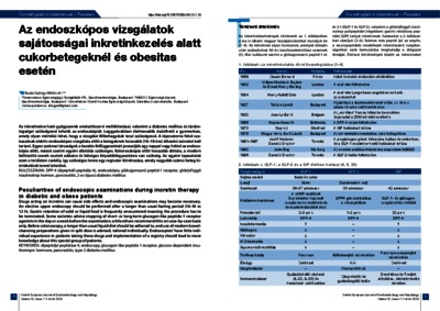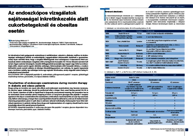 Az inkretinekre ható gyógyszerek emésztőszervi mellékhatásai, valamint a diabetes mellitus és társbetegségei szükségessé tehetik az endoszkópiát. Leggyakrabban ételmaradék észlelhető a gyomorban, amely olyan mértékű lehet, hogy a vizsgálat félbehagyását teszi szükségessé. A tápcsatorna felső szakaszának elektív endoszkópos vizsgálata előtt a betegeknek hosszabb (16–18 óra) étkezési szünetet kell tartani. Egyes szakmai társaságok a kezelés felfüggesztését javasolják egy nappal vagy héttel az endoszkópia előtt, mások szerint egyéni elbírálás szükséges. Kolonoszkópia előtt hosszabb diétára, a modern béltisztító szerek osztott adására és bőséges folyadékfogyasztásra van szükség. Az egyéni tapasztalat ezen a területen csekély, így szükséges lenne egy regiszter létrehozása, amely nagyobb számú beteg kiértékelését tenné lehetővé. | Drugs acting on incretins can cause side effects and endoscopic examinations may become necessary. An elective upper endoscopy should be performed after a longer than usual fasting period (16-18 vs 12 h). Gastric retention of solid or liquid food is frequently encountered meaning the procedure has to be terminated. Some societies advice stopping of short- or long-term glucagon-like peptide-1 receptor agonists in the day or a week before the examination, while others recommend this on case-by-case basis only. Before colonoscopy, a longer than usual liquid diet should be adhered to, and use of modern bowelcleansing preparations given in split dose is advised, tailored individually. Endoscopists’ have little individual experience in patients taking these drugs and implementation of a registry should lead to more knowledge about this special group of patients.