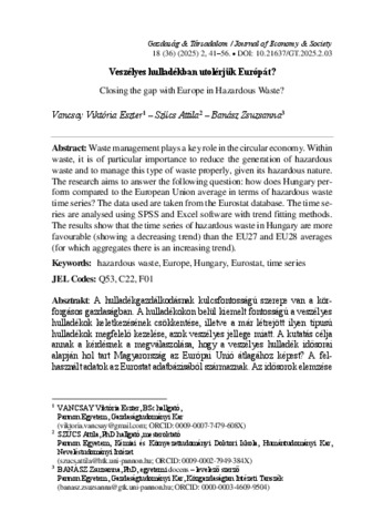 Vancsay, Viktória Eszter and Szűcs, Attila and Banász, Zsuzsanna (2025) Veszélyes hulladékban utolérjük Európát? = Closing the gap with Europe in Hazardous Waste? GAZDASÁG ÉS TÁRSADALOM, 18(36) (41). ISSN 0865-7823