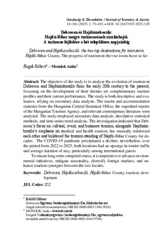 A tanulmány célja Debrecen és Hajdúszoboszló turizmusának fejlődésének vizsgálata a 20. század elejétől napjainkig, különös tekintettel a két település eltérő, ugyanakkor egymást kiegészítő turisztikai profiljának kialakulására és jelenkori teljesítményére. A kutatás deskriptív és értékelő jellegű, amely másodlagos adatelemzésre épül. A Központi Statisztikai Hivatal vendégforgalmi és szálláshely-statisztikái, a Magyar Turisztikai Ügynökség gyorsjelentései, valamint korabeli és jelenkori szakirodalmi források kerültek feldolgozásra. A vizsgálat során másodlagos adatelemzést és leíró statisztikai módszereket és idősoros trendelemzést alkalmaztunk. Az elemzés rámutatott, hogy Debrecen kulturális, rendezvény- és üzleti turizmusra épülő kínálata, valamint Hajdúszoboszló gyógy- és egészségturisztikai profilja évtizedeken át egymást erősítve járult hozzá Hajdú-Bihar megye idegenforgalmi pozíciójának megerősödéséhez. A COVID-19 járvány visszaesést okozott, de a 2022-2025 közötti időszakban mindkét település növekedést mutatott a vendégforgalom és az átlagos tartózkodási idő tekintetében, különösen a külföldi látogatók körében. A hosszú távú versenyképesség érdekében elengedhetetlen a fenntarthatóságot támogató fejlesztések folytatása, a szezonalitás mérséklése, a nemzetközi piacok diverzifikálása, valamint a két település közötti turisztikai szinergiák erősítése. | The objective of the study is to analyse the evolution of tourism in Debrecen and Hajdúszoboszló from the early 20th century to the present, focussing on the development of their distinct yet complementary tourism profiles and their current performance. The study is both descriptive and evaluative, relying on secondary data analysis. The tourist and accommodation statistics from the Hungarian Central Statistical Office, the expedited reports of the Hungarian Tourism Agency, and relevant contemporary literature were analysed. The study employed secondary data analysis, descriptive statistical methods, and time series trend analysis. The investigation indicated that Debrecen’s focus on cultural, event, and business tourism, alongside Hajdúszoboszló’s emphasis on medical and health tourism, has mutually reinforced each other and bolstered the tourism standing of Hajdú-Bihar County for decades. The COVID-19 pandemic precipitated a decline; nevertheless, over the period from 2022 to 2025, both locations had an upsurge in tourist traffic and average duration of stay, particularly among international guests. To ensure longterm competitiveness, it is imperative to advance environmental initiatives, mitigate seasonality, diversify foreign markets, and enhance tourism synergies between the two locales.