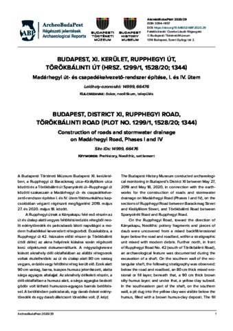 Kurunczi, Mónika (2020) Budapest, XI. kerület, Rupphegyi út, Törökbálinti út (hrsz. 1299/1, 1528/20; 1344) : Madárhegyi út- és csapadékelvezető-rendszer építése, I. és IV. ütem = Budapest, District XI, Rupphegyi Road, Törökbálinti Road (plot no. 1299/1, 1528/20; 1344) : Construction of roads and stormwater drainage on Madárhegyi Road, Phases I and IV. ARCHEOBUDAPEST (29). ISSN 30941857