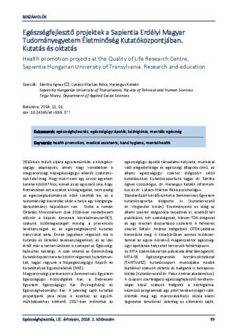Sántha, Ágnes and Lukács-Márton, Réka and Harangus, Katalin (2018) Egészségfejlesztő projektek a Sapientia Erdélyi Magyar Tudományegyetem Életminőség Kutatóközpontjában : Kutatás és oktatás = Health promotion projects at the Quality of Life Research Centre, Sapientia Hungarian University of Transylvania : Research and education. EGÉSZSÉGFEJLESZTÉS, 59 (5). pp. 99-100. ISSN 1786-2434 (nyomtatott); 2498-6666 (elektronikus)