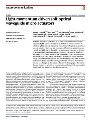Iványi, Tamás Gergely and Slabý, Cyril and Kubacková, Jana and Strejčková, Alena and Jurašeková, Zuzana and Tomori, Zoltán and Hovan, Andrej and Kelemen, Lóránd and Vizsnyiczai, Gaszton and Bánó, Gregor (2025) Light-momentum-driven soft optical waveguide micro-actuators. NATURE COMMUNICATIONS, 16 (1). No. 9852. ISSN 2041-1723
