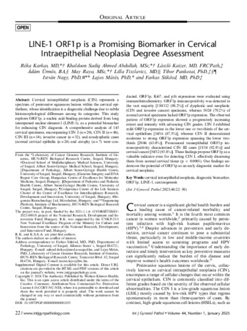 Karkas, Réka and Abdullah, Khaldoon Sadiq Ahmed and Kaizer, László and Ürmös, A and Raya, May and Tiszlavicz, Lilla Györgyi and Pankotai, Tibor and Nagy, István and Mátés, Lajos and Sükösd, Farkas (2025) LINE-1 ORF1p is a Promising Biomarker in Cervical Intraepithelial Neoplasia Degree Assessment. INTERNATIONAL JOURNAL OF GYNECOLOGICAL PATHOLOGY, 44 (1). pp. 22-30. ISSN 0277-1691