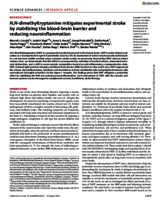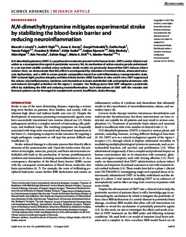 László, János Marcell and Vigh, Judit Piroska and Kocsis, Anna and Porkoláb, Gergő and Hoyk, Zsófia and Polgár, Tamás Ferenc and Walter, Fruzsina and Szabó, Attila and Djurovic, Srdjan and Merkely, Béla Péter and Alpár, Alán and Frecska, Ede and Nagy, Zoltán and Deli, Mária Anna and Nardai, Sándor (2025) N , N -dimethyltryptamine mitigates experimental stroke by stabilizing the blood-brain barrier and reducing neuroinflammation. SCIENCE ADVANCES, 11 (33). ISSN 2375-2548