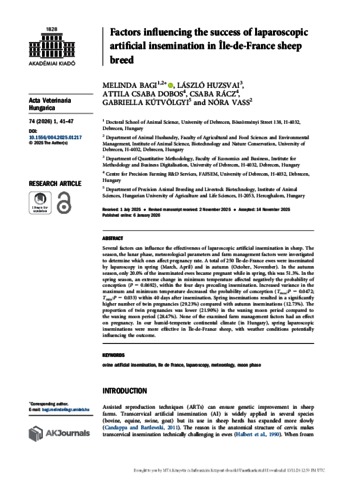 Bagi, Melinda and Huzsvai, László and Dobos, Attila Csaba and Rácz, Csaba and Kútvölgyi, Gabriella and Vass, Nóra (2026) Factors influencing the success of laparoscopic artificial insemination in Île-de-France sheep breed. ACTA VETERINARIA HUNGARICA, 74 (1). pp. 41-47. ISSN 0236-6290