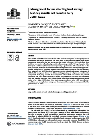 Ivanyos, Dorottya and Lang, Zsolt and Máté, Marietta and Ózsvári, László (2026) Management factors affecting herd average test-day somatic cell count in dairy cattle farms. ACTA VETERINARIA HUNGARICA, 74 (1). pp. 58-66. ISSN 0236-6290
