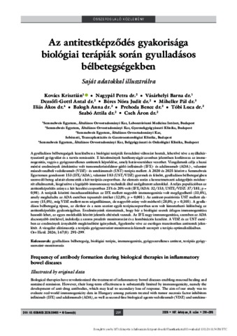 Kovács, Krisztián and Nagypál, Petra and Vásárhelyi, Barna and Dezsőfi-Gottl, Antal and Béres, Nóra and Miheller, Pál and Iliás, Ákos and Balogh, Anna and Prehoda, Bence and Tóbi, Luca and Szabó, Attila and Cseh, Áron (2026) Az antitestképződés gyakorisága biológiai terápiák során gyulladásos bélbetegségekben : Saját adatokkal illusztrálva = Frequency of antibody formation during biological therapies in inflammatory bowel diseases : Illustrated by original data. ORVOSI HETILAP, 167 (8). pp. 291-299. ISSN 0030-6002