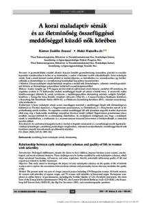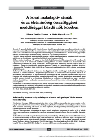 Bevezetés: A gyermekvállalási szándék ellenére hosszan fennálló gyermektelenség szomatikus, pszichés és szociális- kapcsolati vonatkozásban is terhet ró az érintettekre, s ezeket a hatásokat tovább súlyosbíthatják a korai maladaptív sémák. Ezek a sémák hatással vannak például az érzelmi állapotra, az önértékelésre és a stresszkezelésre, így befolyá- solhatják az életminőséget és a termékenységi kezelésekkel kapcsolatos tapasztalatokat. Célkitűzés: A korai maladaptív sémák hatásának vizsgálata a meddő nők életminőségére, valamint e sémák kapcsolatá- nak feltárása az életminőséget potenciálisan befolyásoló személyiségtényezőkkel. Módszer: A jelen vizsgálat egy 179 magyar nő részvételével zajló kutatás részét képezte, amelyben 58 termékeny, 46 organikus eredetű és 75 funkcionális eredetű meddőséggel küzdő nő adatait vetettük össze. A résztvevők online kérdőívcsomagot töltöttek ki, amely tartalmazta a meddőségspecifikus életminőség mérésére szolgáló FertiQoL- kérdőívet, a Young-féle Séma Kérdőív rövidített változatát (YSQ-S3), a Connor–Davidson Resilientia Kérdőívet, a Rosenberg-féle Önértékelés Skálát (RSES-H), az Ötfaktoros Személyiség-kérdőívet (BFI), valamint szociodemog- ráfiai kérdéseket is. Eredmények: A korai maladaptív sémák szoros összefüggést mutattak a meddőséggel küzdő nők életminőségével, különösen az Érzelmi depriváció, a Negativizmus-pesszimizmus, az Önfeláldozás és a Könyörtelen mércék és hi- perkritikusság sémák esetében. Az organikus eredetű meddőséggel élő nők jelentősen nagyobb érzelmi deprivációt éltek meg, míg a funkcionális meddőségi csoportban bizonyos sémák (például Negativizmus-pesszimizmus séma) prediktív szerepet töltöttek be az életminőség alakulásában. Az eredmények rávilágítanak arra, hogy a maladaptív sémák az önértékelésen, a reziliencián és a neuroticizmuson keresztül közvetetten is befolyásolhatják az érintettek pszichés jóllétét. Következtetés: Az eredmények hangsúlyozzák az érzelmi és kognitív mintázatok és a személyiségtényezők figyelembe- vételének jelentőségét a meddőség pszichológiai vizsgálataiban, valamint hozzájárulhatnak a meddőséggel küzdő nők kezelésére irányuló beavatkozások specifikusabbá tételéhez. Orv Hetil. 2026; 167(8): 309–316. | Prolonged childlessness, despite the desire to have children, imposes burdens across somatic, psychological, and social-relational domains. These challenges may be further amplified by early maladaptive schemas, which shape emotional functioning, self-esteem, and stress regulation, thereby potentially influencing quality of life and experiences related to fertility treatments.This study aimed to investigate the impact of early maladaptive schemas on the quality of life of infertile women and to explore the associations between these schemas and personality factors that may modulate the quality of life.The present study was part of a larger research project including 179 Hungarian women: 58 fertile women, 46 women with infertility of organic origin, and 75 women with infertility of functional origin. Participants completed an online battery of questionnaires, including the Fertility Quality of Life (FertiQol) instrument, the short form of the Young Schema Questionnaire (YSQ-S3), the Connor-Davidson Resilience Scale (CD-RISC), the Rosenberg Self-Esteem Scale (RSES-H), the Big Five Inventory (BFI), and sociodemographic questions.Early maladaptive schemas were strongly associated with the quality of life among infertile women, particularly the Emotional Deprivation, Negativism-Pessimism, Self-Sacrifice, and Unrelenting Standards/Hypercriticalness schemas. Women with organic infertility reported significantly higher levels of emotional deprivation, whereas in the functional infertility group, certain schemas (e.g., Negativism-Pessimism) predicted quality of life outcomes. The findings suggest that maladaptive schemas may indirectly influence psychological well-being through their effects on self-esteem, resilience, and neuroticism.These results highlight the importance of considering emotional and cognitive patterns, alongside personality traits, in the psychological assessment of infertility. Such insights may contribute to the development of more targeted and effective interventions for women experiencing infertility. Orv Hetil. 2026; 167(8): 309-316.