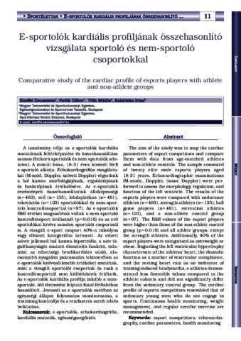 A tanulmány célja az e-sportolók kardiális mutatóinak feltérképezése és összehasonlítása azonos életkorú sportolók és nem sportolók adataival. A mintát húsz, 18-31 éves kiemelt férfi e-sportoló alkotta. Echokardiográfiás vizsgálatokat (M-mód, Doppler, szöveti Doppler) végeztünk a bal kamra morfológiájának, regulációjának és funkciójának értékelésére. Az e-sportolók eredményeit összehasonlítottuk állóképességi (n=483), erő (n=135), labdajátékos (n=491), rekreációs (n=103) sportolókkal és nem-sportoló kontrollcsoporttal (n=97). Az e-sportolók BMI értékei magasabbak voltak a nem-sportoló kontrollcsoport értékeinél (p=0,016) és az erő sportolókat kivéve minden sportolói csoportnál is. A vizsgált e-sport csoport 40%-a túlsúlyos vagy elhízott kategóriába tartozott. Az edzett szívre jellemző bal kamra-hipertrófia, a szív tágulékonyságát mutató diasztolés funkció, valamint az edzettségi bradikardiára utaló, alacsonyabb nyugalmi pulzusszám tekintetében az e-sportolók kedvezőtlenebb értékeket mutattak, mint a vizsgált sportolói csoportok és csak a kontrollcsoporttól nem különböztek értékeik. Az e-sportolók kardiális profilja inkább a nemsportoló, ülő életmódot folytató fiatal férfiakéhoz hasonlított. Javasolt az e-sportolók esetében az egészségi állapot folyamatos monitorozása, a testtömeg kontrollja és a rendszeres aerob edzés beiktatása. | The aim of the study was to map the cardiac parameters of esport competitors and compare them with data from age-matched athletes and non-athlete controls. The sample consisted of twenty elite male esports players aged 18-31 years. Echocardiographic examinations (M-mode, Doppler, tissue Doppler) were performed to assess the morphology, regulation, and function of the left ventricle. The results of the esports players were compared with endurance athletes (n=483), strength athletes (n=135), ball game players (n=491), recreation athletes (n=103), and a non-athlete control group (n=97). The BMI values of the esport players were higher than those of the non-athlete control group (p=0.016) and all athlete groups, except the strength athletes. Additionally, 40% of the esport players were categorized as overweight or obese. Regarding the left ventricular hypertrophy characteristic of the athletes’ heart, the diastolic function as a marker of ventricular compliance, and the resting heart rate as an indicator of training-induced bradycardia, e-athletes demonstrated less favorable values compared to the athletic cohorts and did not significantly differ from the sedentary control group. The cardiac profile of esports competitors resembled that of sedentary young men who do not engage in sports. Continuous health monitoring, weight management, and regular aerobic exercise are recommended.