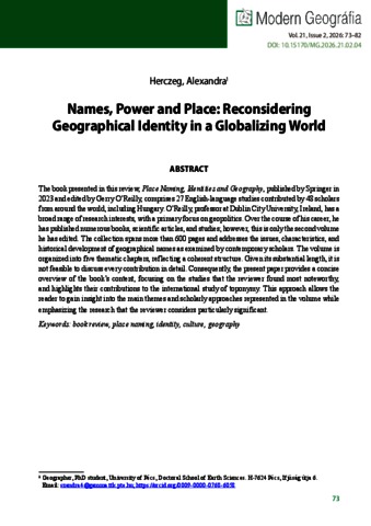 Herczeg, Alexandra (2026) Names, Power and Place: Reconsidering Geographical Identity in a Globalizing World = Recenzió G. O’Reilly (szerk.) Place naming, identities and geography: Critical perspectives in a globalizing and standardizing world című könyvéről. MODERN GEOGRÁFIA, 21 (2). pp. 73-82. ISSN 2062-1655