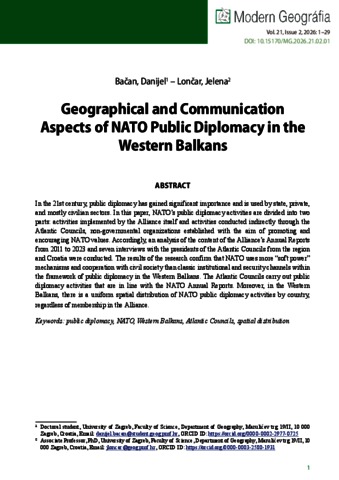 Bačan, Danijel and Lončar, Jelena (2026) Geographical and Communication Aspects of NATO Public Diplomacy in the Western Balkans. MODERN GEOGRÁFIA, 21 (2). pp. 1-29. ISSN 2062-1655