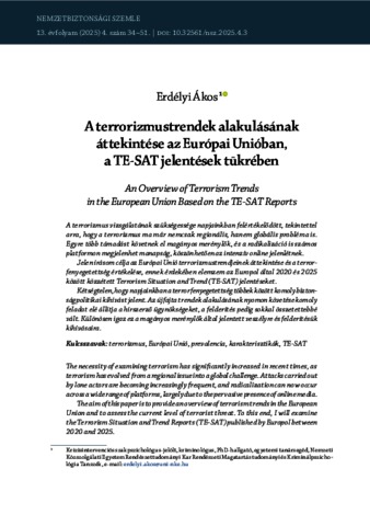 A terrorizmus vizsgálatának szükségessége napjainkban felértékelődött, tekintettel arra, hogy a terrorizmus ma már nemcsak regionális, hanem globális probléma is. Egyre több támadást követnek el magányos merénylők, és a radikalizáció is számos platformon megjelenhet manapság, köszönhetően az intenzív online jelenlétnek. Jelen írásom célja az Európai Unió terrorizmustrendjeinek áttekintése és a terrorfenyegetettség értékelése, ennek érdekében elemzem az Europol által 2020 és 2025 között közzétett Terrorism Situation and Trend (TE-SAT) jelentéseket. Kétségtelen, hogy napjainkban a terrorfenyegetettség többek között komoly biztonságpolitikai kihívást jelent. Az újfajta trendek alakulásának nyomon követése komoly feladat elé állítja a hírszerző ügynökségeket, a felderítés pedig sokkal összetettebbé vált. Különösen igaz ez a magányos merénylők által jelentett veszélyre és felderítésük kihívásaira. | The necessity of examining terrorism has significantly increased in recent times, as terrorism has evolved from a regional issue into a global challenge. Attacks carried out by lone actors are becoming increasingly frequent, and radicalization can now occur across a wide range of platforms, largely due to the pervasive presence of online media. The aim of this paper is to provide an overview of terrorism trends in the European Union and to assess the current level of terrorist threat. To this end, I will examine the Terrorism Situation and Trend Reports (TE-SAT) published by Europol between 2020 and 2025. There is no doubt that terrorism today poses a serious security policy challenge. Tracking the development of new trends is a significant task for intelligence agencies, and the process of detection has become increasingly complex. This is particularly true in the case of lone-actor terrorists, whose threat is especially difficult to detect and counter.
