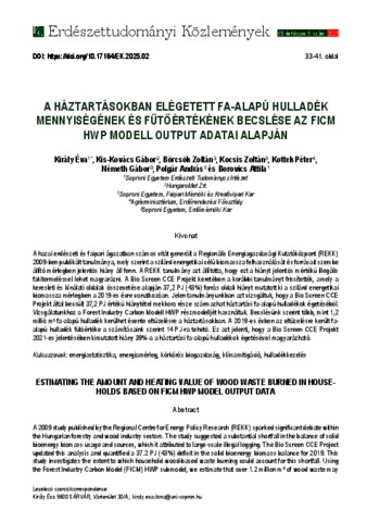 A hazai erdészeti és faipari ágazatban számos vitát generált a Regionális Energiagazdasági Kutatóközpont (REKK) 2009-ben publikált tanulmánya, mely szerint a szilárd energetikai célú biomassza felhasználását és forrásait szembe állító mérlegben jelentős hiány áll fenn. A REKK tanulmány azt állította, hogy ezt a hiányt jelentős mértékű illegális fakitermeléssel lehet magyarázni. A Bio Screen CCE Projekt keretében a korábbi tanulmányt frissítették, amely a keresleti és kínálati oldalak összevetése alapján 37,2 PJ (43%) forrás oldali hiányt mutatott ki a szilárd energetikai biomassza mérlegben a 2019-es évre vonatkozóan. Jelen tanulmányunkban azt vizsgáltuk, hogy a Bio Screen CCE Projekt által becsült 37,2 PJ értékű hiánytétel mekkora része származhat háztartási fa-alapú hulladékok égetéséből. Vizsgálatunkhoz a Forest Industry Carbon Modell HWP részmodelljét használtuk. Becslésünk szerint több, mint 1,2 millió m3 fa-alapú hulladék kerülhet évente eltüzelésre a háztartásokban. A 2019-es évben az eltüzelésre került faalapú hulladék fűtőértéke a számításaink szerint 14 PJ-ra tehető. Ez azt jelenti, hogy a Bio Screen CCE Projekt 2021-es jelentésében kimutatott hiány 39%-a a háztartási fa-alapú hulladékok égetésével magyarázható. | A 2009 study published by the Regional Centre for Energy Policy Research (REKK) sparked significant debate within the Hungarian forestry and wood industry sectors. The study suggested a substantial shortfall in the balance of solid bioenergy biomass usage and sources, which it attributed to large-scale illegal logging. The Bio Screen CCE Project updated this analysis and quantified a 37.2 PJ (43%) deficit in the solid bioenergy biomass balance for 2019. This study investigates the extent to which household wood-based waste burning could account for this shortfall. Using the Forest Industry Carbon Model (FICM) HWP submodel, we estimate that over 1.2 million m³ of wood waste may be burned annually in households. The heating value of this burned wood-based waste for 2019 is estimated at 14 PJ, explaining 39% of the shortfall identified in the Bio Screen CCE Project’s 2021 report.