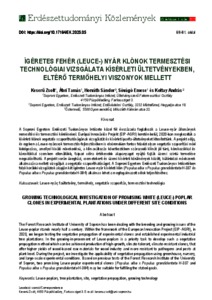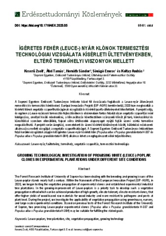 A Soproni Egyetem Erdészeti Tudományos Intézete közel fél évszázada foglalkozik a Leuce-nyár állományok nemesítési és termesztési kérdéseivel. Európai Innovációs Projekt (EIP-AGRI) keretén belül, 2020-ban megkezdtük a kísérleti klónok vegetatív szaporíthatóságának vizsgálatát és kísérleti iparifa-ültetvényeket létesítettünk. A projekt célja, és egyben a Leuce-nyárasok termesztés-fejlesztésében is elsőrendűen fontos feladat olyan vegetatív szaporítási mód kidolgozása, amellyel kiváló növekedésű, a klímaváltozás következtében szárazodó klímát jól tűrő, kórokozókkal és károsítókkal szemben ellenállóbb, faipari célra értékesebb alapanyagot nyújtó fajták üzemi szintű termelése megvalósítható. A projekt során üvegházi, csemetekerti és üzemi kísérleti körülmények között, különböző módszerek alkalmazása mellett vizsgáljuk a vegetatív szaporíthatóságot. A Soproni Egyetem Erdészeti Tudományos Intézetében folyó korábbi vizsgálatok alapján két ígéretes Leuce-nyár kísérleti klón (Populus alba x Populus grandidentata H-337 és Populus alba x Populus grandidentata H-384) alkalmas lehet a megfogalmazott célok teljesítéséhez. | The Forest Research Institute of University of Sopron has been dealing with the breeding and growing issues of the Leuce-poplar stands nearly half a century. Within the framework of the European Innovation Project (EIP-AGRI), in 2020, we began testing the vegetative propagation of experimental clones and established experimental industrial tree plantations. In the growing-improvement of Leuce-poplars is a priority task to develop such a vegetative propagation method which can be achieved production of high-growth, climate-tolerant, climate-resistant clones, that offer higher yields of wood-based raw materials for wood industry and more resistant to pathogens and pests at plant-level. During the project, we investigate the applicability of vegetative propagation using greenhouse, nursery, and large-scale experimental conditions. Based on previous tests of the Forest Research Institute of the University of Sopron, two promising Leuce-poplar experimental clones (Populus alba x Populus grandidentata H-337 and Populus alba x Populus grandidentata H-384) may be suitable for fulfilling the stated goals.