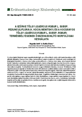 Hegedüs, Ivett and Bartha, Dénes (2025) A szürke tölgy (Quercus Robur L. SUBSP. Pedunculiflora (K. Koch) menitsky) és a kocsányos tölgy (Quercus Robur L. SUBSP. Robur) termésbélyegeinek összehasonlító morfológiai vizsgálata = Morphological comparison of greyish oak (Quercus robur L. subsp. pedunculiflora (K. Koch) Menitsky) and pedunculate oak (Quercus robur L. subsp. robur) acorns. ERDÉSZETTUDOMÁNYI KÖZLEMÉNYEK, 15 (1-2). pp. 151-164. ISSN 2062-6711
