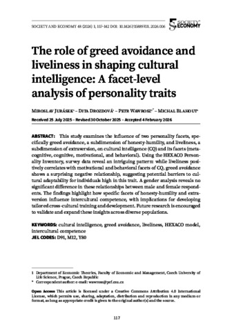 Jurásek, Miroslav and Drozdová, Dita and Wawrosz, Petr and Blahout, Michal (2026) The role of greed avoidance and liveliness in shaping cultural intelligence: A facet-level analysis of personality traits. SOCIETY AND ECONOMY, 48 (1). pp. 117-142. ISSN 1588-9726