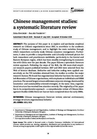 Koczkás, Sára and Vaszkun, Balázs (2026) Chinese management studies: a systematic literature review. SOCIETY AND ECONOMY, 48 (1). pp. 36-58. ISSN 1588-9726