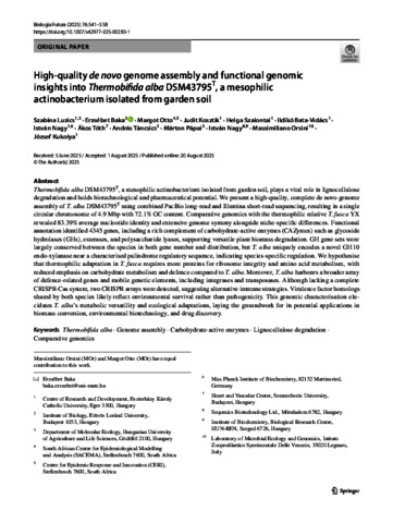 Luzics, Szabina and Baka, Erzsébet and Margot, Otto and Kosztik, Judit and Szalontai, Helga and Batáné Vidács, Ildikó and Nagy, István and Tóth, Ákos and Táncsics, András and Pápai, Márton and Nagy, István and Orsini, Massimiliano and Kukolya, József (2025) High-quality de novo genome assembly and functional genomic insights into Thermobifida alba DSM43795T, a mesophilic actinobacterium isolated from garden soil. BIOLOGIA FUTURA, 76. pp. 541-558. ISSN 2676-8615