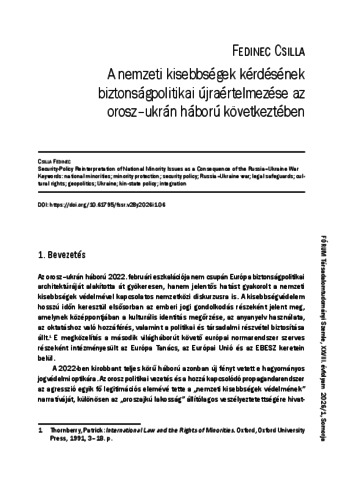 Fedinec, Csilla (2026) A nemzeti kisebbségek kérdésének biztonságpolitikai újraértelmezése az orosz–ukrán háború következtében. FÓRUM TÁRSADALOMTUDOMÁNYI SZEMLE: A SZLOVÁKIAI MAGYAR TUDOMÁNYOS MŰHELYEK FOLYÓIRATA, XXVIII (1). pp. 121-140. ISSN 1335-4361