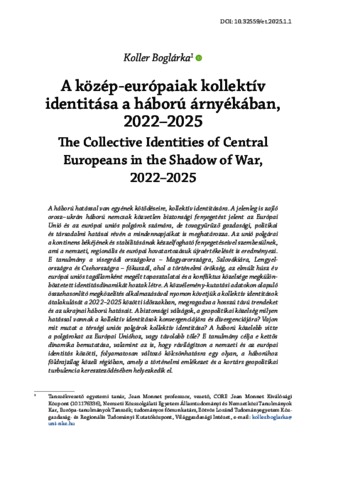 A háború hatással van egyének kötődéseire, kollektív identitására. A jelenleg is zajló orosz–ukrán háború nemcsak közvetlen biztonsági fenyegetést jelent az Európai Unió és az európai uniós polgárok számára, de tovagyűrűző gazdasági, politikai és társadalmi hatásai révén a mindennapjaikat is meghatározza. Az unió polgárai a kontinens békéjének és stabilitásának kézzelfogható fenyegetéseivel szembesülnek, ami a nemzeti, regionális és európai hovatartozásuk újraértékelését is eredményezi. E tanulmány a visegrádi országokra – Magyarországra, Szlovákiára, Lengyelországra és Csehországra – fókuszál, ahol a történelmi örökség, az elmúlt húsz év európai uniós tagállamként megélt tapasztalatai és a konfliktus közelsége megkülönböztetett identitásdinamikát hoztak létre. A közvélemény-kutatási adatokon alapuló összehasonlító megközelítés alkalmazásával nyomon követjük a kollektív identitások átalakulását a 2022–2025 közötti időszakban, megragadva a hosszú távú trendeket és az ukrajnai háború hatásait. A biztonsági válságok, a geopolitikai közelség milyen hatással vannak a kollektív identitások konvergenciájára és divergenciájára? Vajon mit mutat a térségi uniós polgárok kollektív identitása? A háború közelebb vitte a polgárokat az Európai Unióhoz, vagy távolabb tőle? E tanulmány célja e kettős dinamika bemutatása, valamint az is, hogy rávilágítson a nemzeti és az európai identitás közötti, folyamatosan változó kölcsönhatásra egy olyan, a háborúhoz földrajzilag közeli régióban, amely a történelmi emlékezet és a kortárs geopolitikai turbulencia kereszteződésében helyezkedik el.