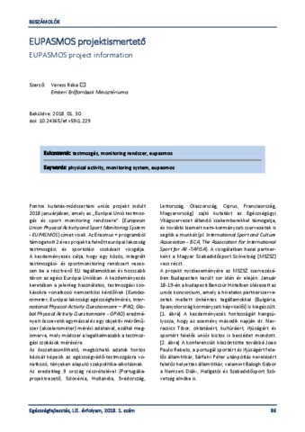 Veress, Réka (2018) EUPASMOS projektismertető = EUPASMOS project information. EGÉSZSÉGFEJLESZTÉS, 59 (1). pp. 86-87. ISSN 1786-2434 (nyomtatott); 2498-6666 (elektronikus)