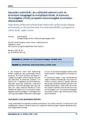 Erdei, Gergő (2018) Kapcsolat a szénhidrát-, és a zsírbevitel valamint a szív- és érrendszeri betegségek és mortalitásuk között, öt kontinens 18 országában (PURE): prospektív kohorszvizsgálat ismertetése - cikkismertetés = Associations of fats and carbohydrate intake with cardiovascular disease and mortality in 18 countries from five continents (PURE): a prospective cohort study - paper review. EGÉSZSÉGFEJLESZTÉS, 59 (1). p. 70. ISSN 1786-2434 (nyomtatott); 2498-6666 (elektronikus)